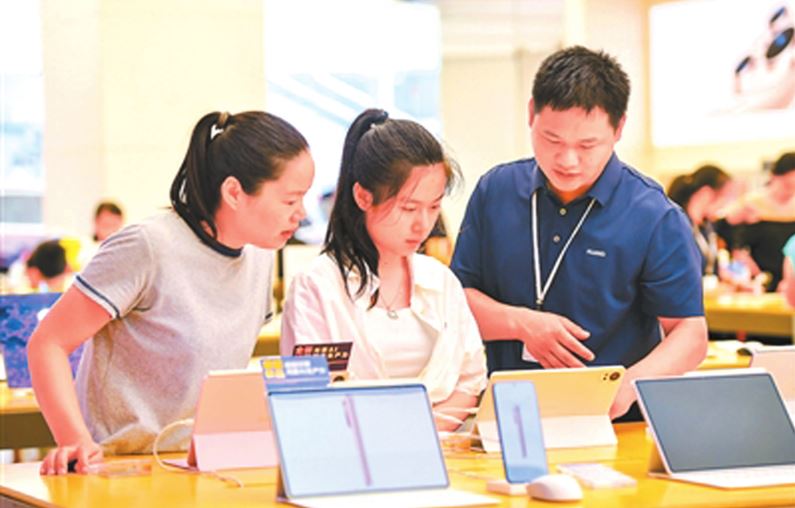 在江西省宜春市袁州區(qū)潤達(dá)國際購物中心的電子數(shù)碼產(chǎn)品專營店內(nèi),工作人員向消費(fèi)者介紹平板電腦產(chǎn)品。