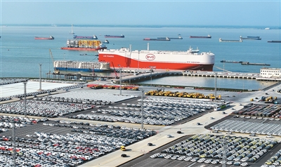 4月27日,搭載7000余輛比亞迪新能源商品車的汽車運(yùn)輸船比亞迪“深圳”號首航駛往巴西,創(chuàng)下國內(nèi)汽車單次出口量一個批次最多的紀(jì)錄。圖為運(yùn)輸船正在江蘇省蘇州港太倉港區(qū)裝載汽車。計海新攝(人民視覺)
