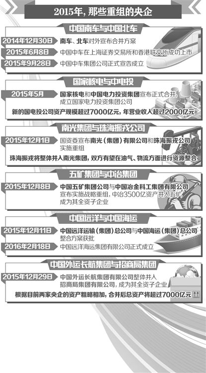 2015年,央業(yè)重組邁出重要步伐。有6對(duì)12家企業(yè)完成了重組,涉及至少27家上市公司,一批包括裝備制造、能源、航運(yùn)在內(nèi)的央企實(shí)現(xiàn)兼并重組,中央企業(yè)也由112家減至106家。2016年以來(lái),繼1月25日中材集團(tuán)與中建集團(tuán)發(fā)布公告稱(chēng)實(shí)施戰(zhàn)略重組之后,中國(guó)國(guó)旅集團(tuán)與中國(guó)港中旅集團(tuán)也發(fā)布公告稱(chēng)籌劃戰(zhàn)略重組。此外,中航動(dòng)力、成發(fā)科技、中航動(dòng)控三家公司則于日前發(fā)布重組公告。離國(guó)務(wù)院國(guó)資委直接監(jiān)管的中央企業(yè)數(shù)量減至100家僅有“一步之遙”。