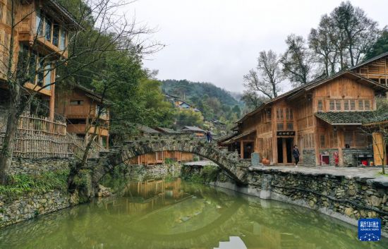 3月18日,在貴州省榕江縣栽麻鎮(zhèn)大利侗寨,村民從月亮山居民宿的小石橋上經過(無人機照片)。