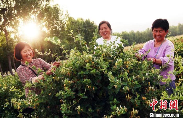 夕陽(yáng)下,山西省運(yùn)城市新絳縣澤掌鎮(zhèn)喬溝頭村,花農(nóng)趙藕平(左)和鄰里采摘豐收的金銀花。高新生 攝
