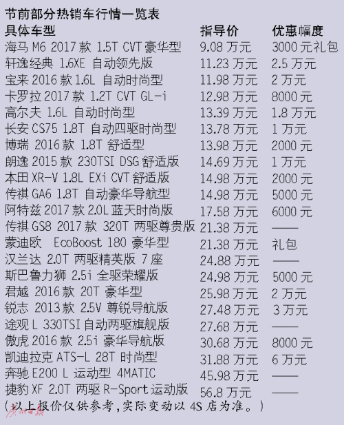 有經(jīng)銷商表示,由于今年春節(jié)來得比較早,目前大部分汽車品牌還沒有接到新一年的市場(chǎng)促銷政策,因此市場(chǎng)上還沒有出現(xiàn)大力降價(jià)促銷的情況,基本保持原有優(yōu)惠幅度。記者留意到,節(jié)前最后半個(gè)月,也有部分車型有較大的讓利幅度,但多為在廣州本地銷量較為一般的高端車或豪華車,如凱迪拉克、英菲尼迪等部分車型,優(yōu)惠基本超過6萬元以上;進(jìn)口大眾途銳的優(yōu)惠高達(dá)10萬元以上;樓蘭也有高達(dá)7萬元優(yōu)惠。而熱銷車型,如卡羅拉,近期只有6000~8000元優(yōu)惠,比此前的1.2萬~1.6萬元優(yōu)惠縮水不少;朗逸近期也只有8000~1萬元讓利,比此前也縮水近一半。經(jīng)銷商建議,如果不急著節(jié)前買車,等到節(jié)后看看也不遲。