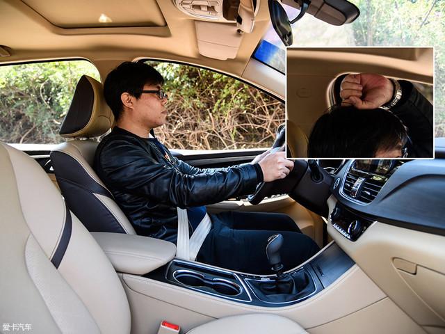 身高為172cm的體驗(yàn)者坐入駕駛席,將座椅高度調(diào)至最低,頭部空間剩余一拳多。