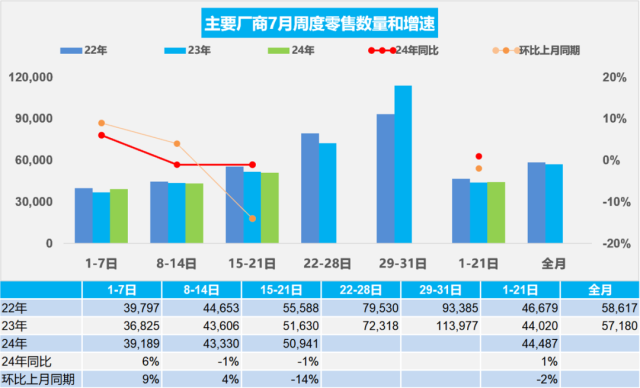 在新能源乘用車市場(chǎng)方面,7月1-21日,乘用車新能源市場(chǎng)零售46.1萬(wàn)輛,同比去年同期增長(zhǎng)26%,較上月同期下降2%,今年以來(lái)累計(jì)零售457.4萬(wàn)輛,同比增長(zhǎng)32%。