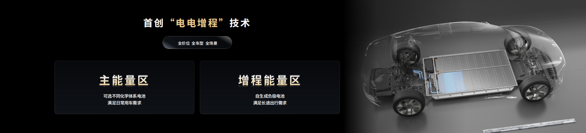 驍遙雙核電池首創(chuàng)的“電電增程”技術,能夠結(jié)合車輛的行駛狀態(tài)和用戶駕駛習慣,智能調(diào)控兩個能量區(qū)的分配策略。主能量區(qū)可以根據(jù)用戶的駕駛習慣與場景,適配不同化學體系的電芯,滿足日常用車需求;增程能量區(qū)可采用高比能自生成負極技術,提供更大的電量,以滿足用戶的長途出行需求。