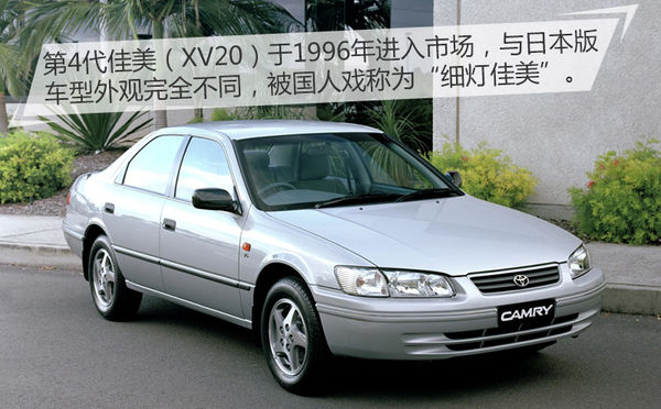 第4代佳美(XV20)于1996年進入市場,進入國內(nèi)的仍是佳美海外版車型,在設(shè)計上與日本本土版采用了完全不同的理念。讓整車看上去更加修長流暢,車頭和車尾都被設(shè)計得趨于扁平,由此帶來的是更細長的頭燈和尾燈,所以XV20在國內(nèi)被人們戲稱為“細燈佳美”。