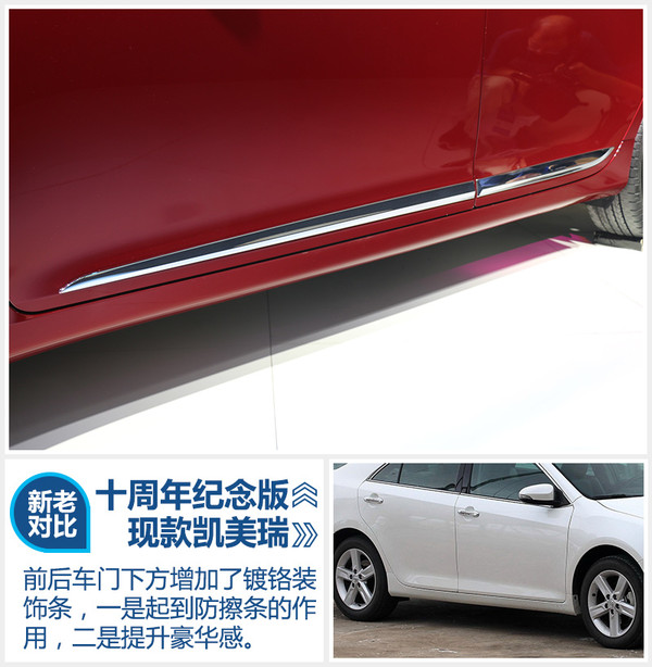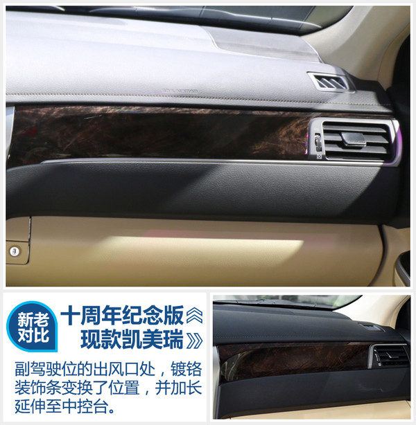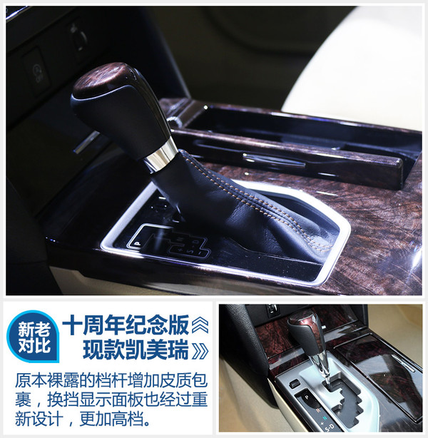 凱美瑞的“蛇形”換擋機制一直是筆者非常喜歡的設(shè)計,最起碼在開車的時候不會因為換錯擋而發(fā)生意外碰撞。但是說實話,裸露的檔桿總覺得缺了點什么。十周年紀(jì)念版將檔桿周圍加上了皮質(zhì)包裹,立馬將中控臺的“氣質(zhì)”提升了一個檔次,筆者本人是非常喜歡的。另外,副駕駛面前的木紋面板也增加了一條鍍鉻裝飾。