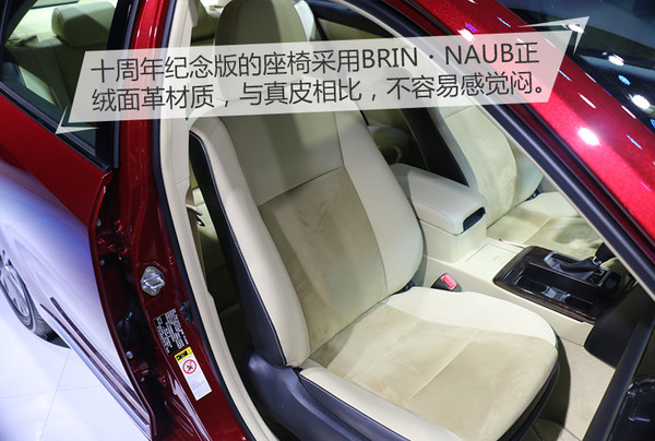 十周年紀(jì)念版凱美瑞將原本就已經(jīng)是真皮包裹的座椅更換了“新裝”,采用了最新研發(fā)的BRIN?NAUB材質(zhì)的正絨面革。與真皮材質(zhì)相比,這種全新的材料不容易有悶的感覺,夏天的時候不會越坐越熱。冬天的時候,剛坐進車?yán)镆膊粫杏X特別涼,這樣直接省去了再配坐墊的麻煩。BRIN?NAUB材質(zhì)還具有更好的彈性和延展性,長期坐壓之后不易變形。