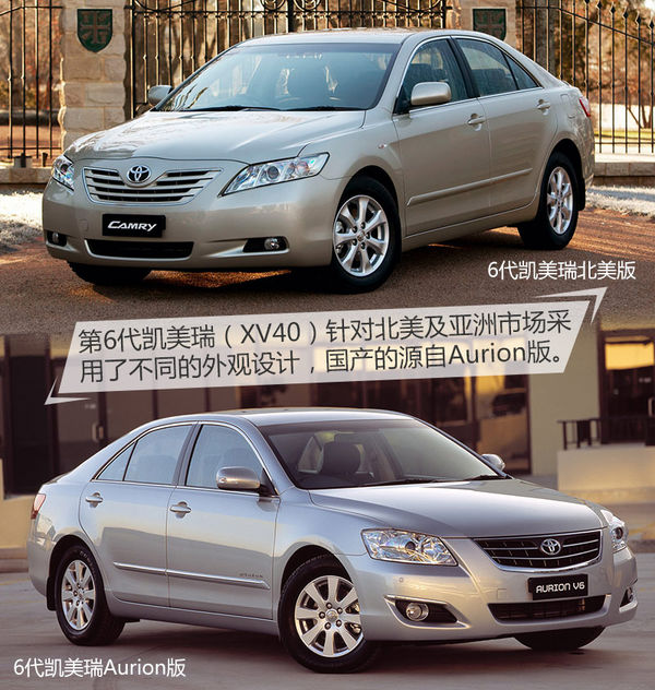 第6代凱美瑞(XV40)誕生于2006年,6月17日正式上市,由廣汽豐田進行本土化生產(chǎn)。雖然是豐田的全球化車型,但是XV40針對北美及亞洲市場采用了不同的外觀設(shè)計。北美版的車燈更加“鋒利”更加年輕運動,而國產(chǎn)的凱美瑞則采用了更加符合東方審美的亞洲版造型,又被稱作Prestige版或Aurion版。
