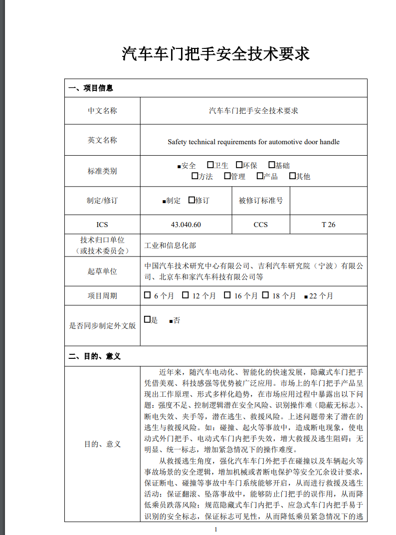 該文件中稱,近年來,隨汽車電動化、智能化的快速發(fā)展,隱藏式車門把手憑借美觀、科技感強等優(yōu)勢被廣泛應用。市場上的車門把手產(chǎn)品呈現(xiàn)出工作原理、形式多樣化趨勢,在市場應用過程中暴露出以下問題:強度不足、控制邏輯潛在安全風險、識別操作難(隱蔽無標志)、斷電失效、夾手等,潛在逃生、救援風險。上述問題帶來了潛在的逃生與救援風險。如:碰撞、起火等事故中,造成斷電現(xiàn)象,使電動式外門把手、電動式車門內把手失效,增大救援及逃生阻礙;無明顯、統(tǒng)一標志,增加緊急情況下的操作難度。