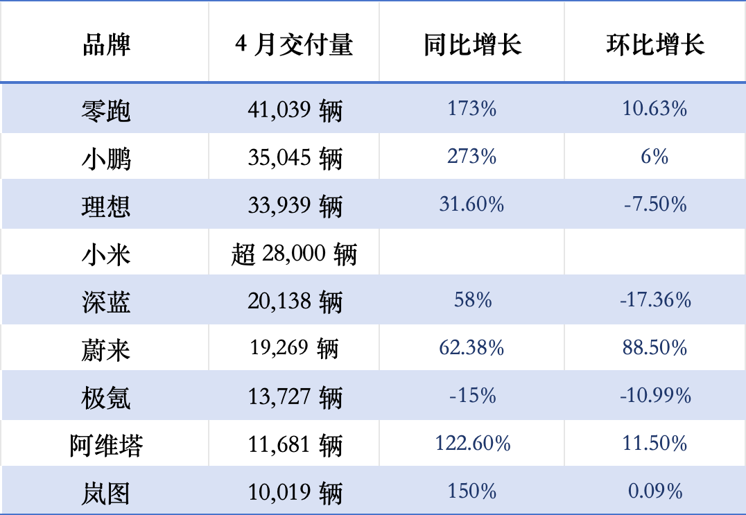 盡管行業(yè)淘汰賽加速,但多數(shù)新勢力品牌仍保持強勁增長勢頭。4月零跑、小鵬、嵐圖、阿維塔等都實現(xiàn)了翻倍增長,單品牌月交付量超2萬輛的品牌達到了5個,去年同期只有兩個品牌月交付量超2萬輛。