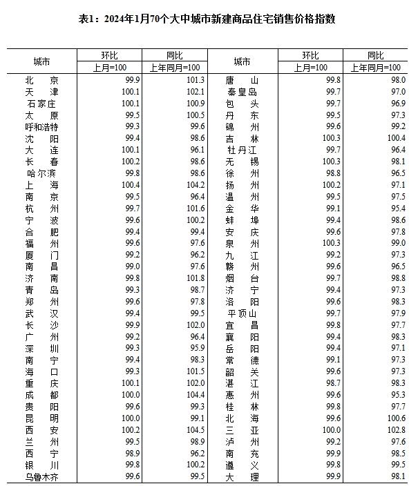 中新網2月23日電 國家統(tǒng)計局網站發(fā)布2024年1月份70個大中城市商品住宅銷售價格變動情況。國家統(tǒng)計局城市司統(tǒng)計師王中華解讀表示,2024年1月份,70個大中城市中商品住宅銷售價格環(huán)比下降城市個數減少,商品住宅銷售價格環(huán)比降幅整體收窄、同比整體延續(xù)降勢。