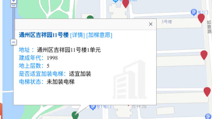 公眾可在地圖上精準查詢相關樓棟及單元的基礎信息、加梯現(xiàn)狀、是否具備加梯條件和本單元不適宜加梯的原因等信息。對適宜加裝電梯的單元,可在線“一鍵”提出加梯意愿。