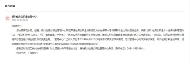 收到留言后,銀川住房公積金管理中心作出公開回復(fù)。回復(fù)稱:經(jīng)查,銀川住房公積金管理中心現(xiàn)已開通住房公積金貸款還款方式在等額本息和等額本金之間的互轉(zhuǎn)業(yè)務(wù)。網(wǎng)友可以持相關(guān)材料至柜面辦理住房公積金還款方式變更業(yè)務(wù)。