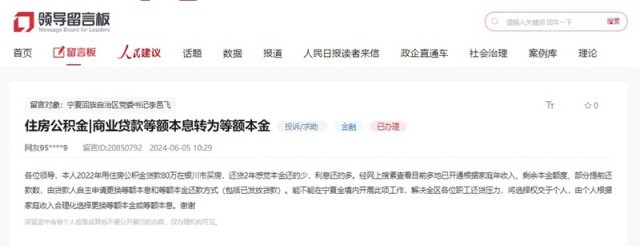 該網(wǎng)友上網(wǎng)查詢得知,目前多地已開通還款方式在等額本息與等額本金之間互轉(zhuǎn)的業(yè)務(wù),借款人可自主申請更換等額本息和等額本金還款方式(包括已發(fā)放貸款),希望寧夏相關(guān)部門也可以開展此項(xiàng)工作,解決全區(qū)各位職工還貸壓力。