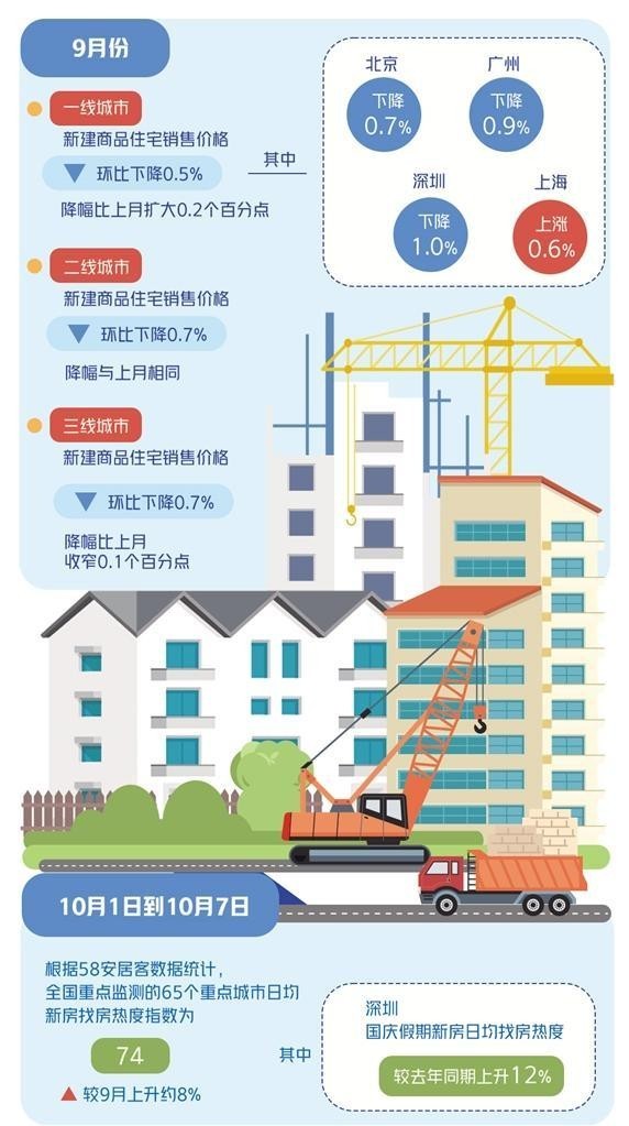 9月26日,中央政治局會議定調(diào)“要促進(jìn)房地產(chǎn)市場止跌回穩(wěn)”,釋放出“穩(wěn)地產(chǎn)”信號。隨后,一線城市集中優(yōu)化樓市政策,廣州全面取消限購,北京、上海、深圳優(yōu)化限購、限貸政策,北京、上海明確將及時取消普宅認(rèn)定標(biāo)準(zhǔn),深圳取消限售,上海、深圳增值稅免征年限“5改2”,帶動國慶假期樓市熱度顯著提升。