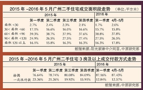 中原研究部監(jiān)測(cè)的陽(yáng)光家緣數(shù)據(jù)顯示,120平方米的物業(yè)在2016年4月~5月份成交占比較第一季度提升了1.5個(gè)百分點(diǎn),對(duì)于打算生二孩的老百姓來(lái)說(shuō),一方面,人口增多,需要提前購(gòu)置大房;另一方面,在低利率的時(shí)代,買(mǎi)房不僅可以使資產(chǎn)保值增值,對(duì)抗通脹,也能利用低利率政策減少購(gòu)房成本支出。在2016年成交的3房及以上的物業(yè)付款方式來(lái)看,按揭貸款的占比呈一路走高的態(tài)勢(shì),2016年1月~5月份占比在87%的水平,較2015年第三季度多了7個(gè)百分點(diǎn)左右。