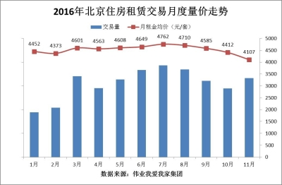 按照慣例,10月之后北京租賃市場進(jìn)入傳統(tǒng)淡季,剛剛過去的11月,北京月租金均價創(chuàng)年內(nèi)新低。據(jù)偉業(yè)我愛我家集團(tuán)市場研究院統(tǒng)計,2016年11月,北京區(qū)域通過我愛我家達(dá)成的住宅租賃交易量環(huán)比10月同期上漲14.8%,但月租金均價為4107元/平米,環(huán)比10月下跌6.9%。