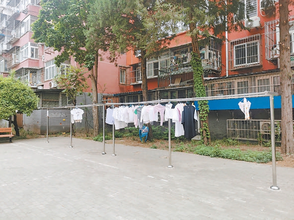 走出古城南路社區(qū)東門,沿古城東街北行400余米右轉(zhuǎn)進(jìn)入八角北路社區(qū),只見幾株高大的國槐及道邊的綠藤錯(cuò)落有致。再向里走,是一塊寬闊的活動(dòng)場(chǎng)地,北側(cè)建有一排不銹鋼晾衣架,架上晾滿了衣服?!坝芯用裉岢黾依镪柵_(tái)上晾衣服不方便,我們特地尋找合適地方,為這些社區(qū)建了晾衣架?!北本┦课飿I(yè)有限公司(以下簡(jiǎn)稱石房物業(yè))副經(jīng)理孫偉說。