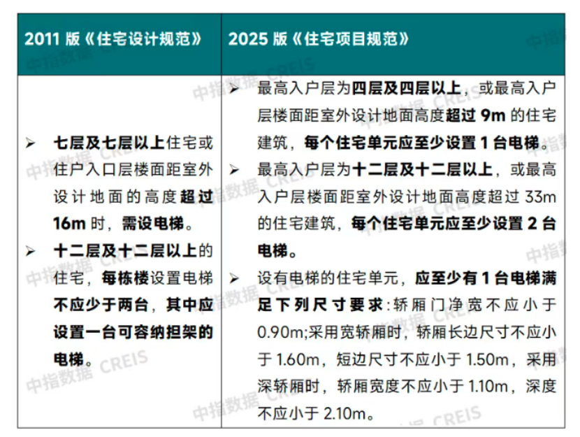 電梯設(shè)置方面,新版《住宅項(xiàng)目規(guī)范》降低了電梯設(shè)置的樓層要求,從原規(guī)定“七層及以上需設(shè)電梯”調(diào)整為“四層及以上需設(shè)電梯”。