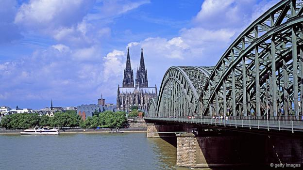 科隆霍亨索倫橋始建于第一次世界大戰(zhàn)前,該橋設(shè)計(jì)獨(dú)特,體現(xiàn)了當(dāng)時石材工程與鋼鐵結(jié)構(gòu)的完美結(jié)合。大橋于1911年完工,橋長共409米,橫跨萊茵河。1945年3月,為了減緩盟軍向柏林行進(jìn)的速度,橋梁被德軍炸毀?,F(xiàn)在該橋已被成功修繕并成為德國最繁忙的鐵路線路。橋上的鋼鐵結(jié)構(gòu)形似鯨魚的脊背,柵欄上掛滿了情侶們的“愛情鎖”。如今這座橋已經(jīng)成為團(tuán)結(jié)和愛的象征。