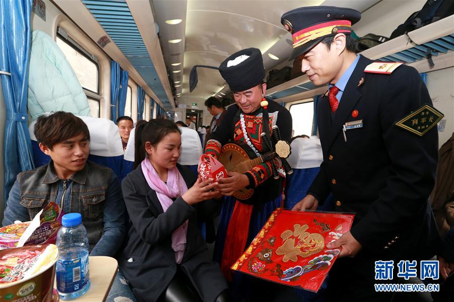 2月1日,彝族藝術(shù)家在K165次列車上為旅客表演。當(dāng)日,在西安鐵路局西安至昆明的K165次列車上,四川美姑縣原生態(tài)畢摩樂隊(duì)與西安客運(yùn)段職工民樂小分隊(duì)聯(lián)合舉辦“英雄列車民族之聲親情溫暖回家路”音樂會(huì),畢摩樂隊(duì)用口弦、哈門、木葉、瑪布等彝族民間樂器演奏的音樂為返鄉(xiāng)過年的旅客提前送上新年祝福。民間藝術(shù)家和列車乘務(wù)員還為旅客們送上“?!弊帧⒋郝?lián)。新華社發(fā)