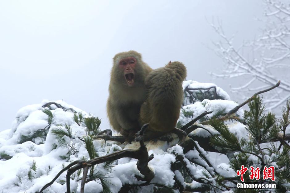 2月22日正值元宵佳節(jié),湖南張家界核心景區(qū)武陵源喜降春雪。在黃石寨景區(qū),成群的野生獼猴或在雪中追逐戲鬧,或在樹(shù)枝上攀爬跳躍,或蜷縮著身子賣(mài)萌,成為張家界武陵源的一道春季新景。吳勇兵 攝