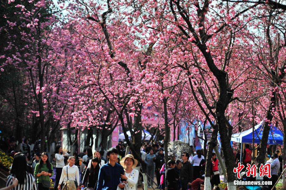 昆明櫻花盛放 市民踏春賞花