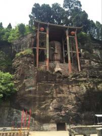 沿石梯而上,一面數(shù)百平米的石壁上,一尊大佛坐西向東,依巖而建。據(jù)測(cè)量,大佛高15.85米,寬11米。其中頭高7.7米,面寬4.6米。佛頭之上,一座木質(zhì)廊亭像一把巨傘,為其遮風(fēng)蔽雨。胸側(cè)各站一力士,均高1.9米,腰系裙,穿甲,甲紋似魚鱗,身繞帔帛,立于臺(tái)基上。大佛胸下部分與高聳巖石融為一體,氣勢(shì)磅礴。