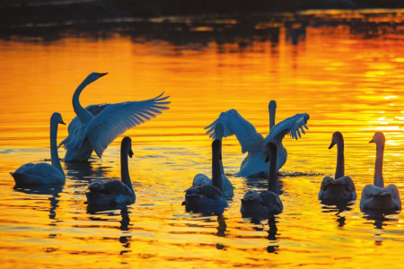 夕陽下運(yùn)城市千年鹽湖內(nèi)的天鵝。
