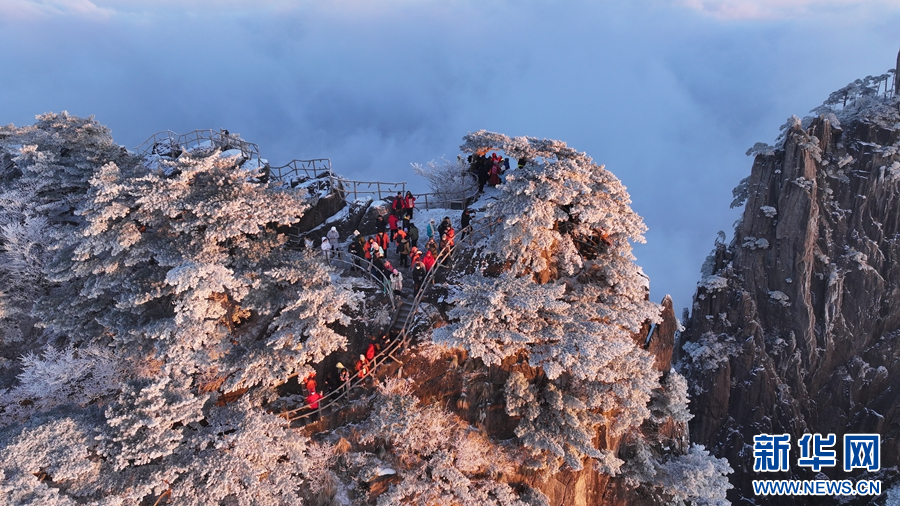 近日,安徽黃山雪后初霽,山峰銀裝素裹,滿目玉樹瓊枝。云霧如同舞者般在白雪皚皚的峰巒間穿梭嬉戲,宛如一幅渾然天成的水墨丹青。