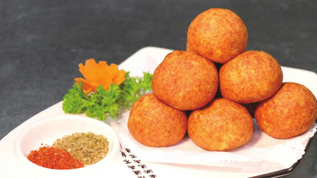 豆腐丸子精選五臺山鹵水豆腐,擠出多余水分,壓成細(xì)膩豆腐碎,加入佐料攪拌,揉成圓潤緊實的丸子,蒸制后在麥芽糖水中定型再開炸,外衣漸鍍“金甲”,內(nèi)里卻保持著豆腐的柔嫩本味。