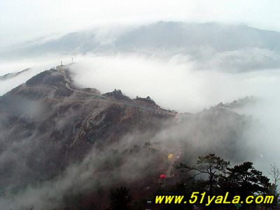 北武當(dāng)山主峰四周幾乎都是陡壁懸崖,只有一條人造“天梯”可攀。來(lái)到山腳下,過(guò)五里黃土、五里沙路,便是1400余級(jí)就山鑿筑的石階,凡險(xiǎn)峻之處,設(shè)有鐵索扶手。石階一線疊置,從下仰視,宛如“天梯”。游人攀登,每一步都可聽(tīng)到悠揚(yáng)頓挫的“石音”,形成獨(dú)特的“石樂(lè)”絕景。沿著石階,奇松異石、廟宇石刻,掩沒(méi)在蔥郁的山林植被之中,相間點(diǎn)綴,相映成趣。主要的山石景觀有:古猿望日、石豬受難、九龍出洞、石象守山、天壺傾露、石羊朝圣、石龜下蛋、石虎、石蛤蟆、龜蛇斗智等。最令人稱奇的是“龜蛇斗智”奇觀,相傳神龜和青蛇不安心修道,互相格斗,經(jīng)過(guò)七七四十九天的麈戰(zhàn),神龜節(jié)節(jié)敗退,青蛇步步緊逼。其時(shí),恰逢真武大帝返宮,見(jiàn)狀,輕輕用手指一點(diǎn),龜蛇便動(dòng)彈不得,從此永久停留在這里,成千古一絕——“蛇石”虎視眈眈,“龜石”尾臨懸崖,萬(wàn)斤重石,峭立崖畔,用力一推或經(jīng)風(fēng)一吹,便搖搖欲墜,令人心懸,所以又稱風(fēng)動(dòng)石,為我國(guó)罕見(jiàn)的景觀之一。主要的奇松景觀有:鴛鴦松、迎客松、托天松、母子松等。最使人嘆為觀止的是“擎天探海松”,其松立于石階半道,樹(shù)身技分兩杈,一直刺青天,一枝瞰群峰。近金頂?shù)悄咸扉T石階,旁邊陡崖上刻有“喬松”二字,據(jù)載為清代道光年間永寧州牧王繼賢手跡?,F(xiàn)存喬松樹(shù)樁直徑近1米,可以想見(jiàn)其昔日雄姿。主要的懸崖峭壁有:千仞壁、舍身崖、鷹嘴崖等。還有呈垂直分布的植被,其色彩和花期隨季節(jié)變化,給北武當(dāng)山披上了“春粉、夏艷、秋紅、冬白”的盛裝。登臨武當(dāng)之巔,一覽眾山,但見(jiàn)遠(yuǎn)山蒼茫,近日含黛,松風(fēng)撲面,白云飄逸;只聞松濤陣陣,山泉潺潺,鳥語(yǔ)唧唧,似琴弦輕撥;夏秋之季,如晴空萬(wàn)里,金頂之下,叢林景觀相間,似七彩織錦;白云遠(yuǎn)處,群山連綿,猶如萬(wàn)龍翻騰,極為壯觀。