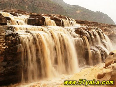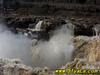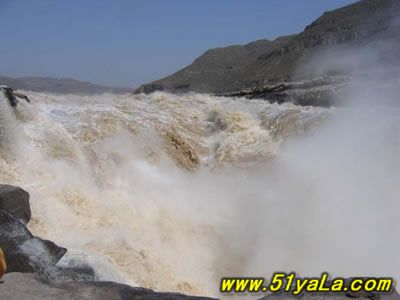 壺口瀑布位于吉縣城西45公里、距臨汾市165公里處的晉陜峽谷黃河河床中,為世界上最大的黃色瀑布,因其氣勢(shì)雄渾而享譽(yù)中外。此地兩岸夾山,河底石巖上沖刷成一巨溝,寬達(dá)30米,深約50米,滾滾黃水奔流至此,倒懸傾注,若奔馬直入河溝,波浪翻滾,驚濤怒吼,震聲數(shù)里可聞。其形如巨壺沸騰,故名。黃河浪濤激起一團(tuán)團(tuán)霧煙云隨著水霧的升高,煙云由黃變灰、由灰變藍(lán),景色奇麗,有“水底生煙”之說(shuō)。壺口瀑布不僅有“水底冒煙”,“彩橋通天”奇景,更有“旱地行船”之說(shuō)。上游船只到此,必須離水登陸,經(jīng)人抬或車運(yùn)繞過(guò)壺口(即所謂“旱地行船”)方可入水續(xù)航,千百年來(lái),概莫能變。