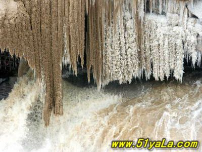 由于四季氣候和水量的差異,壺口景色也時(shí)有所變。壺口的春秋兩季,景象也甚為奇特,有氣為虹,橫浮水上,形成了“岸旁無(wú)虹掛長(zhǎng)雨”的景觀。春回大地的時(shí)候,漫山遍野的山桃花盛開(kāi),黃河冰岸消融,水量適度平穩(wěn),主瀑、副瀑連成一片,看主瀑云霧迷蒙,望副瀑萬(wàn)壑千流,觀“龍槽”如巨龍掀浪,稱為“三月桃花汛”;秋季9-11月份雨季剛過(guò)去時(shí),河邊眾多山泉小溪,匯集大量清流,陣陣秋風(fēng)吹過(guò),常有彩虹出現(xiàn),叫做“壺口秋風(fēng)”。明陳維藩《壺口秋風(fēng)》詩(shī)有“秋風(fēng)卷起千層浪,晚日迎來(lái)萬(wàn)丈紅”句,可謂真實(shí)寫照。這兩個(gè)時(shí)期,水大而穩(wěn),瀑布寬度可達(dá)千米左右。主瀑難以接近,但遠(yuǎn)遠(yuǎn)望去,煙波浩淼,威武雄壯。大浪卷著水泡,奔騰咆哮,以翻江倒海之勢(shì),飛流而下。壺口的冬日,又是一種奇觀:壺口兩側(cè),冰簾垂掛,晶瑩剔透,格外誘人,農(nóng)歷小雪,大雪前后,上游漂流下來(lái)的大冰塊,落入壺口平緩處,冰塊相交,冰峰凍結(jié),冰橋天然合成,人履冰橋,如走坦途,人們稱為“壺口叉橋”。在天橋村附近,積冰成橋,冰橋下激流滾滾,濤聲大作,人們稱之為“天橋”。