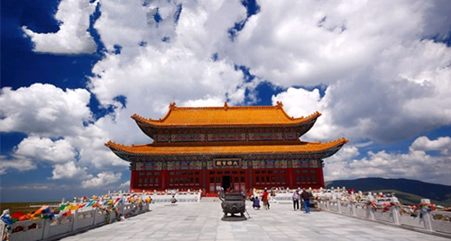 夏日的中臺頂青綠如黛,碧如翡翠,猶似一堆巨大的祖母綠。游人走累了,躺在細若絲絨、猶若天然地毯的青草上,面向天空,感覺天藍藍的,云柔柔的,風輕輕的,特別清爽。飄動著的白云,千變?nèi)f化地追蹤著人們的足跡,還癡癡地纏繞在身前身后,讓人如置身仙境,美妙異常。