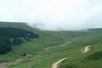 荷葉坪因其山體像荷葉而得名。位居寧武、五寨、岢嵐三縣交界處,在管涔山上與蘆芽山、馬倫草原成三足鼎立的態(tài)勢。最高處海拔2784米,比蘆芽山主峰還高。為晉西北最高峰,電視差轉(zhuǎn)臺(tái)4844就建在主峰。整個(gè)山體屬花崗巖結(jié)構(gòu),但寬廣的頂部覆蓋著厚厚的土層,經(jīng)過多年的雨雪滋養(yǎng),特別適合林木和牧草及中藥材生長。每到夏日,綠草如茵,鮮花盛開,空氣清新。這時(shí)周邊三縣的村民就將牛馬趕上坪臺(tái),做好記號(hào),不再管了,深秋時(shí)再去找回。