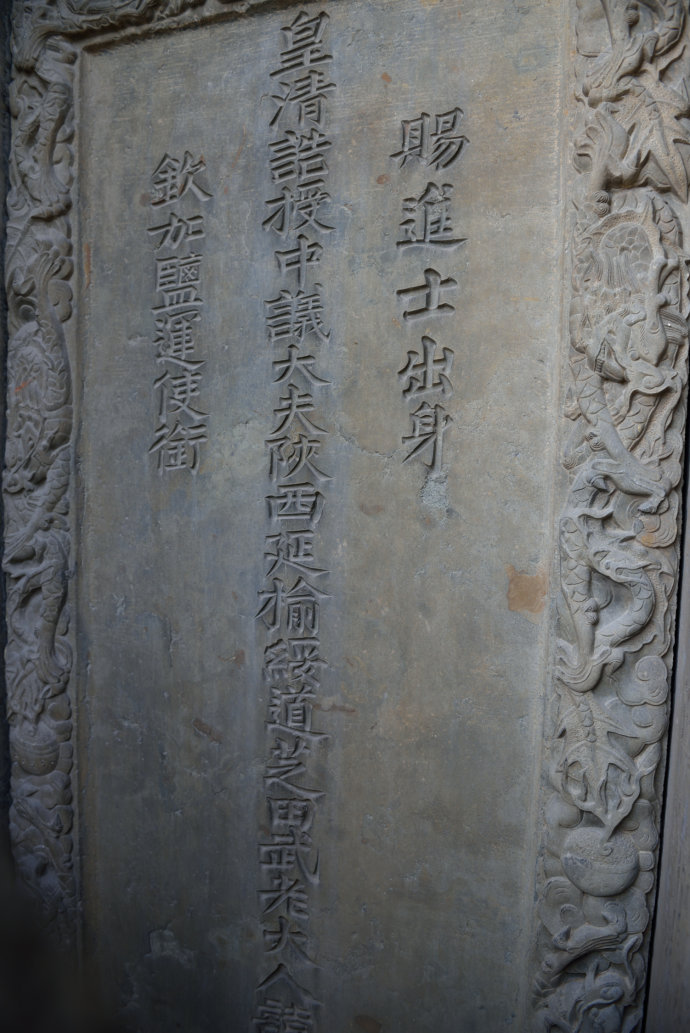 配坊實(shí)際上是一座功名石牌坊,上面刊載著武訪疇一家四代人的姓名及朝廷贈(zèng)封的官爵,咸豐六年(1856)由武訪疇修建。這座石雕牌坊與其它牌坊最大的區(qū)別就是沒(méi)有題刻坊名,因此只能稱之為配坊。坐北向南,為四柱三間三樓單檐歇山頂結(jié)構(gòu),牌樓高8米,寬12米,坊體坐落在近1米高的長(zhǎng)方形臺(tái)基上,立柱仍然采用夾柱石固定。坊頂覆蓋青瓦,正脊飾石雕貔貅裝飾,飛檐翹角,明樓檐下為“圣旨”牌,當(dāng)心間設(shè)兩層小字板,第一層題刻:“贈(zèng)資政大夫曾祖父廷桂,贈(zèng)夫人曾祖母李氏;誥贈(zèng)資政大夫祖父秉壁,誥贈(zèng)夫人祖母吳氏;誥贈(zèng)資政大夫父烈,誥封夫人母朱氏。陜西分巡延榆綏兵備道、加四級(jí)武訪疇謹(jǐn)建。”第二層題刻“大清咸豐六年歲次丙辰仲夏上院榖旦”。武訪疇借建坊要弘揚(yáng)祖輩陰德,而祖輩的姓氏大名又不能題刻在母親的節(jié)孝牌坊上,所以,他必須另建一坊才能完整地表達(dá)心愿。實(shí)際上,這就是建造配坊的真正目的。也正因此在配坊題刻“龍光錫寵”、“鳳詔褒榮”、“克成先志”、“重裕后昆”等。