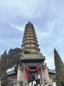 廣勝寺景區(qū)分為上寺、下寺和水神廟三處建筑。飛虹塔、《趙城金藏》、水神廟元代壁畫(huà),并稱為“廣勝三絕”。站在飛虹塔下仰望,美輪美奐的塔身不禁令人稱奇,塔身47.31米高、共13層,底座為八角形,坐落在山上的飛虹塔散發(fā)著威嚴(yán)肅穆的氣息。塔前聚集著眾多游客,有人在靜靜欣賞建筑,有人在默默禱告祈福。新春登高,在塔前祈愿新的一年所愿皆所得,所行皆坦途。
