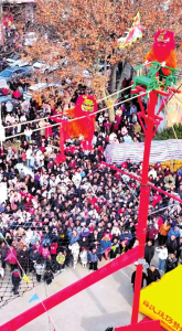 春節(jié)期間,永濟(jì)市虞鄉(xiāng)鎮(zhèn)土樂(lè)村村民自發(fā)組織的民間藝術(shù)團(tuán),向省內(nèi)外游客表演省級(jí)非遺項(xiàng)目——永濟(jì)空中飛獅。