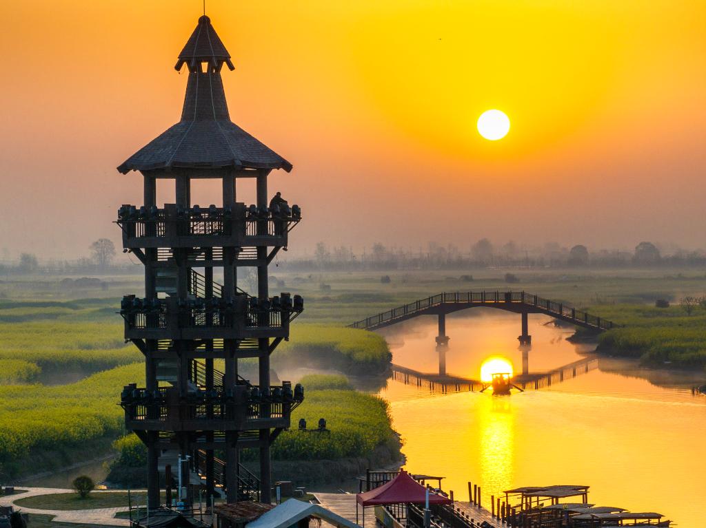 ??2025年4月8日拍攝的江蘇省興化市千垛景區(qū)日出晨景(無人機(jī)照片)。新華社發(fā)(周社根 攝)