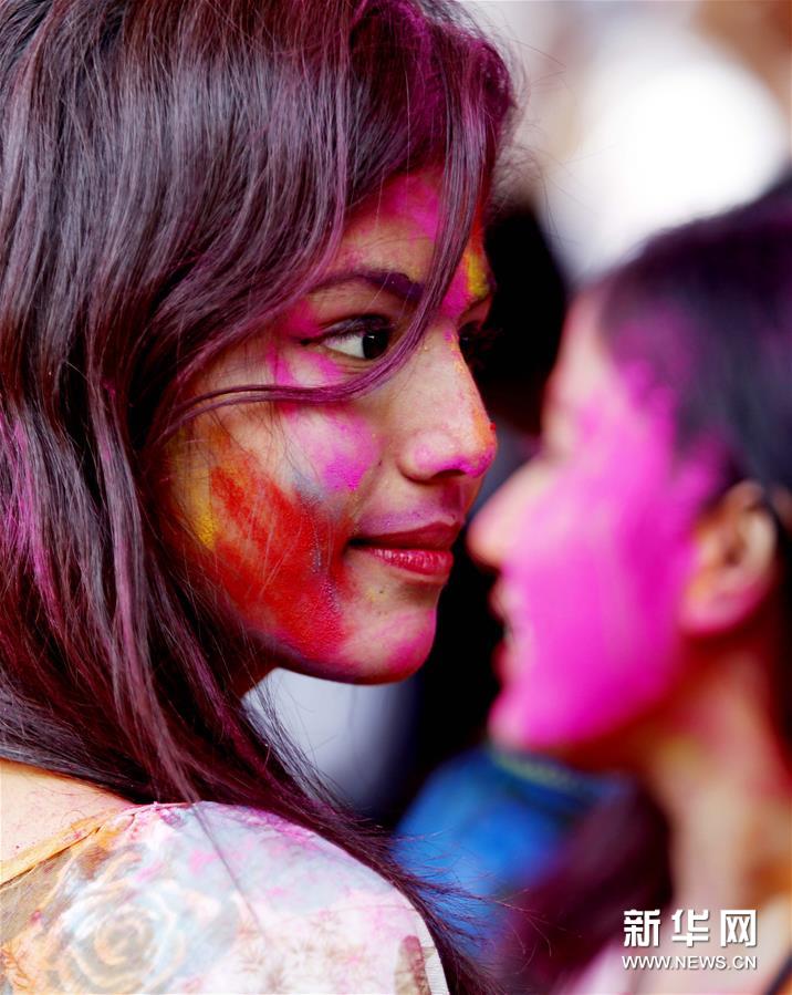 胡里節(jié)也叫“灑紅節(jié)”,人們?cè)谧约耗樕虾蜕砩贤可项伭?,還向別人拋撒五顏六色的顏料和粉末,迎接春天的到來(lái)。新華社發(fā)(吳昂 攝)