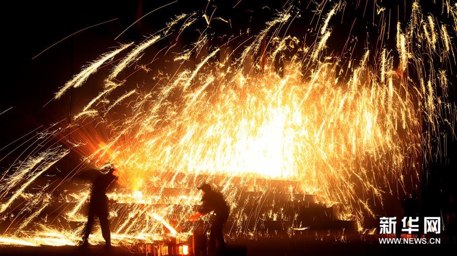 1月12日,河北磁縣開始舉行“打鐵花”慶新年活動?!按蜩F花”是以小煉鐵爐將生鐵化成鐵水后,用木板將鐵水加鋸末打上天空,鋸末在空中燃燒形成“鐵花火雨”四濺飛揚的景象。打鐵花”是當?shù)貧v史悠久的民俗娛樂活動。新華社發(fā) (趙鴻宇 攝)