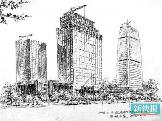 “以前工作日需要上班,我就利用周末在街巷間走動(dòng),看到地標(biāo)建筑就開始畫。遇到正在施工的高樓,我就計(jì)算著日子,到高樓即將封頂?shù)臅r(shí)候,我就帶上紙筆到施工現(xiàn)場畫畫?!眳橇⒅薪榻B。