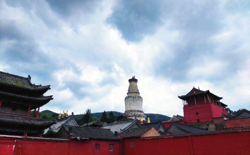 五臺山最具代表性的鈴聲就是從塔院寺高聳入云的大白塔上傳出的風(fēng)鈴聲。大白塔環(huán)周83.8米,通高75.3米,塔高56.4米,比北京北海白塔還高20.5米,比代縣阿育王塔高16.5米,是元大德五年(1301年)由尼泊爾匠師阿尼哥設(shè)計建造的尼泊爾式大塔,也是我國現(xiàn)存元代最高的覆缽式塔建筑。大白塔基座呈東、西、南、北、東南、東北、西南、西北八角形,塔身上面13層,呈由粗及細的輪狀造型,稱“十三天”,又名“十三相輪”?!笆臁鄙厦嫔w著8塊銅板,按乾、坎、艮、震、巽、離、坤、兌八卦位置安裝,周長23.1米,檐邊吊裝銅質(zhì)垂檐36塊,共安裝風(fēng)鈴108個,連同束腰風(fēng)鈴共252個。塔頂裝有高5.4米的鍍金寶瓶。整座白塔形如藻瓶,上下比例協(xié)調(diào),造型別致典雅。每當(dāng)風(fēng)吹鈴響,風(fēng)鐸鳴四端,悠然成風(fēng)韻,讓人油然而生崇敬之感。