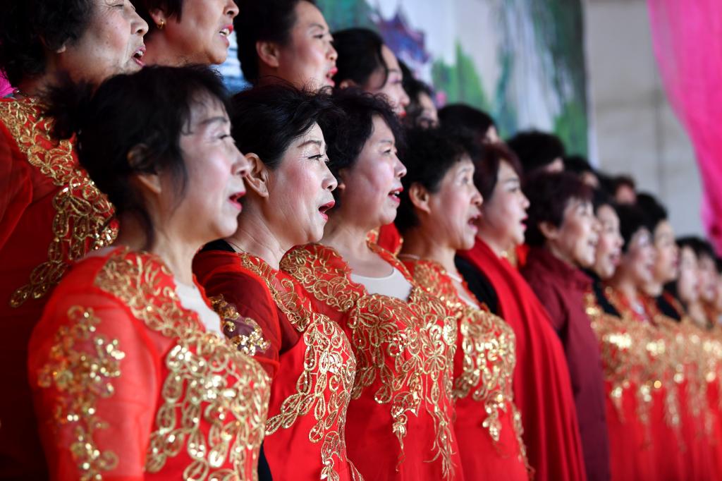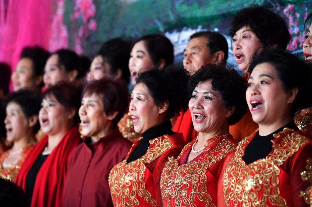 ↑1月3日,在山西省渾源縣荊莊村,渾源縣貧困山區(qū)合唱團(tuán)在表演大合唱《祝福祖國(guó)》。