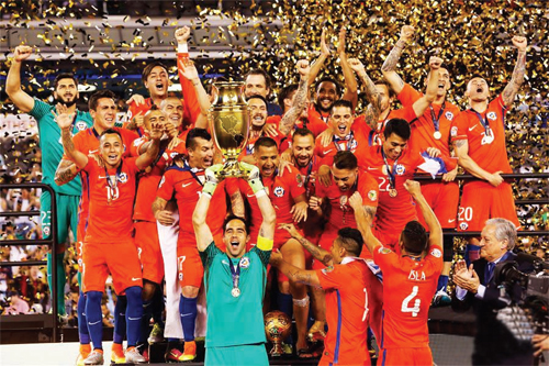 6月26日,智利隊(duì)門將布拉沃(前左一)在頒獎儀式上捧杯慶祝奪冠。當(dāng)日,2016年百年美洲杯決賽在美國新澤西舉行,智利隊(duì)與阿根廷隊(duì)在120分鐘內(nèi)0比0戰(zhàn)平,智利隊(duì)在點(diǎn)球大戰(zhàn)中以4比2戰(zhàn)勝阿根廷隊(duì),奪得冠軍。 (責(zé)任編輯:武丹) |