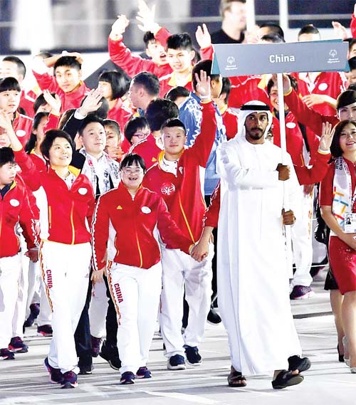 3 月14 日,李想(中)與自己的偶像、前奧運冠軍李小鵬(前排右五)隨中國代表團在2019 年阿布扎比夏季特奧會開幕式上入場。
