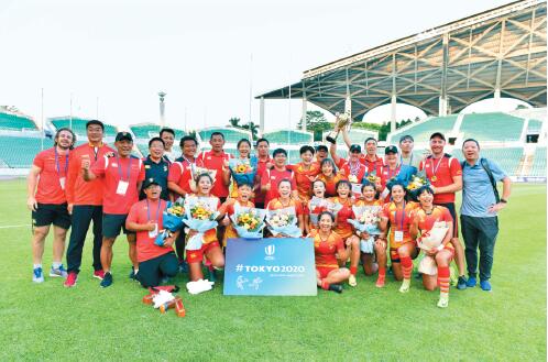 11月10日,在廣州舉行的2020年東京奧運會女子七人制橄欖球亞洲區(qū)資格賽決賽中,中國隊以33比0戰(zhàn)勝中國香港隊,進(jìn)軍東京奧運會。圖為中國女子七人制橄欖球隊隊員賽后合影慶祝。新華社發(fā)殷啟明攝