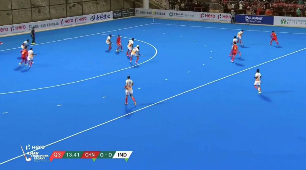 在冠軍爭奪戰(zhàn)中,中國隊迎戰(zhàn)實力強勁的印度隊。比賽一開始,雙方便展開激烈對攻,印度隊幾次制造威脅,均被中國隊輕松化解。第一節(jié)比賽進行到10分鐘左右時,印度隊連續(xù)獲得兩次短角球機會,但均未能取得進球。隨后印度隊試圖通過長傳配合射門,也被中國隊守門員成功防住。